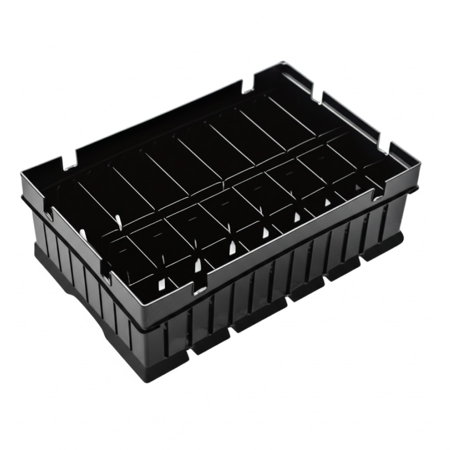 Cajas y charolas rígidas para transporte de partes medianas/livianas (manijas, sensores, clips).